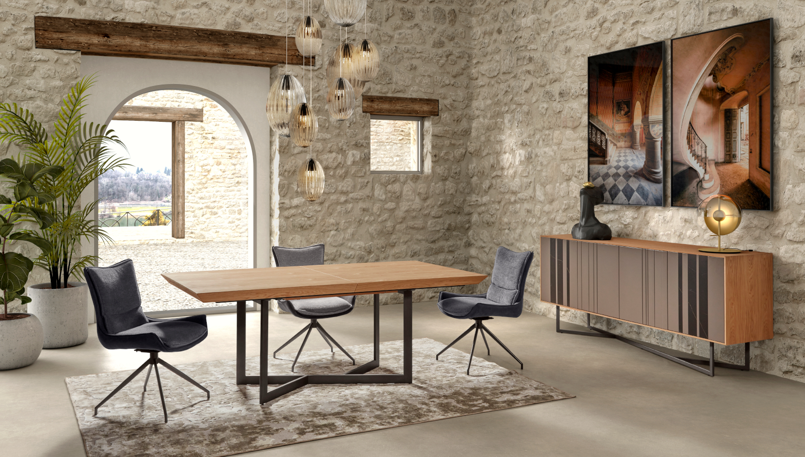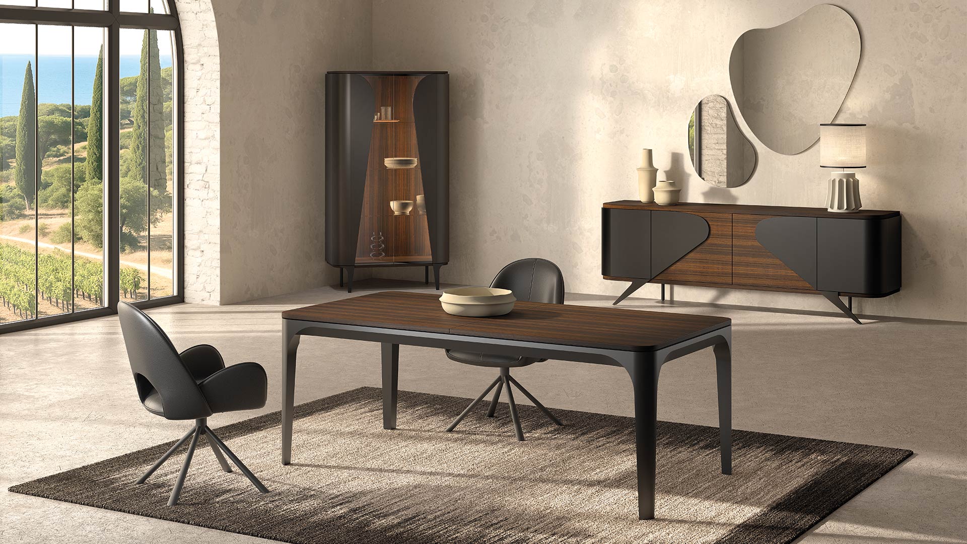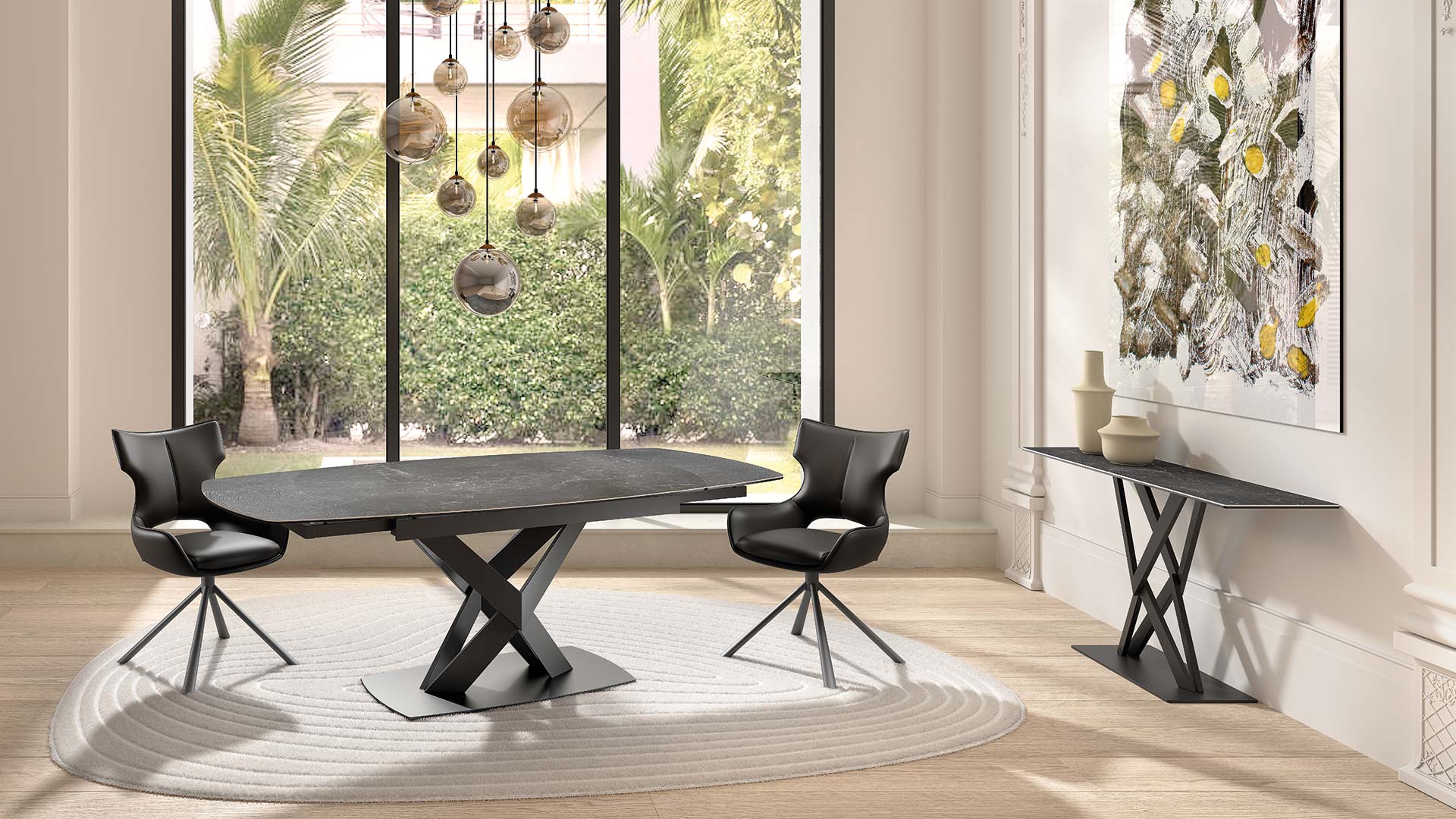 La salle à manger DESTINAA allie lignes arrondies et design structuré pour un style contemporain inspiré des années 70. Ses finitions raffinées et ses matériaux nobles créent un espace à la fois élégant, chaleureux et haut de gamme.